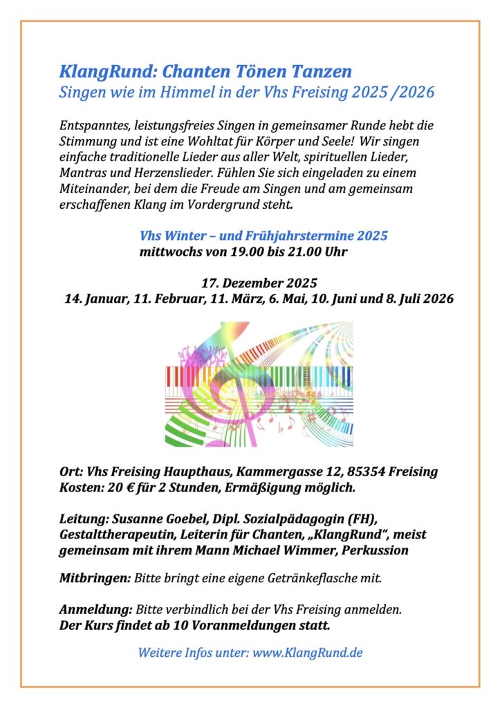 Anmeldung: Bitte bis zum Montag vor Kursbeginn verbindlich bei der Vhs Freising oder unter info@klangrund.de anmelden.