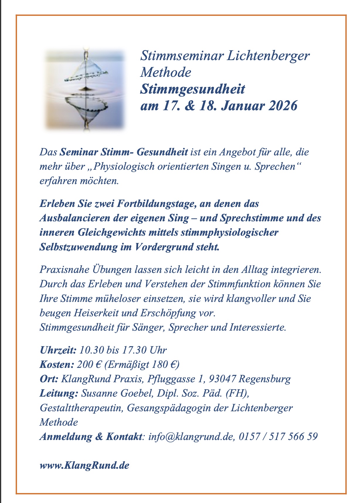 Das Grundlagenseminar Stimm- Gesundheit ist ein Angebot für alle, die „physiologisch orientiertes Singen u. Sprechen“ erleben möchten und wissen wollen, welche grundlegenden Prinzipien unterstützend für Ihre Stimme sind.