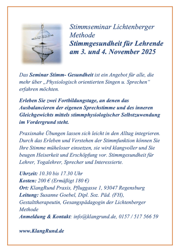 Sensorische Wahrnehmungsübungen und Körperarbeit die Basis der Stimmerfahrung. In Kommunikation mit unserer Stimmphysiologie und dem parasympatischen Nervensystem – welches für Erholung und Rekonvaleszenz zuständig ist- öffnen wir neue Wege für unseren Stimmklang und zu unserer eigenen authentischen Stimme.