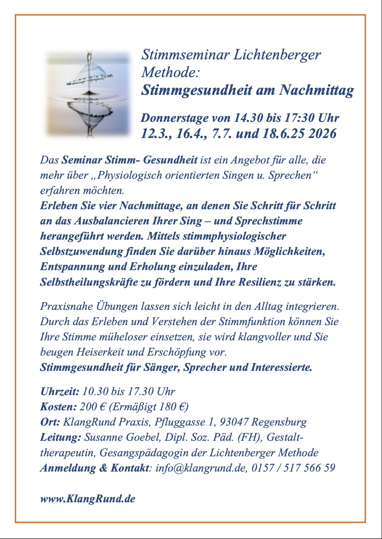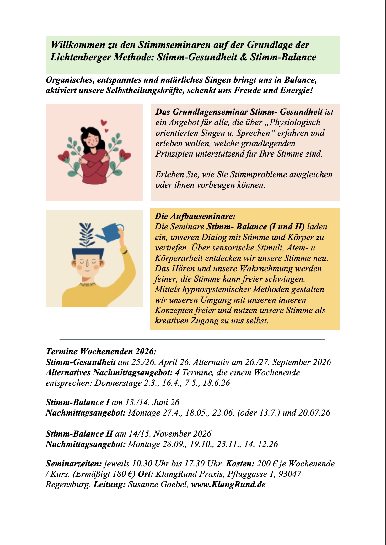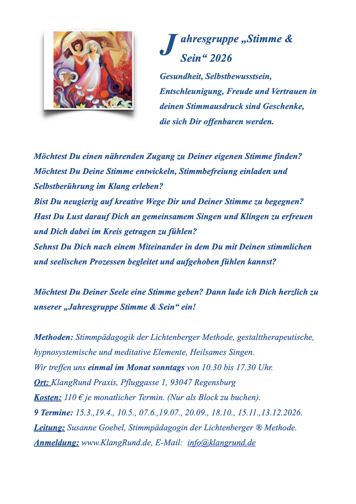 Achtsam und spielerisch begegnen wir uns, entdecken unseren Stimmklang und unser pulsierendes, lebendiges Sein. Wir entdecken die Möglichkeiten verschiedene Frequenzen in unserer Stimme zum Klingen zu bringen und unsere Hörgewohnheiten zu erweitern. Wir lernen Entspannung und Erholung über unseren Umgang mit der Stimme einzuladen und somit unsere Selbstheilungskräfte zu fördern und unsere Resilienz zu stärken.